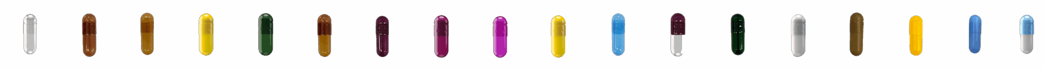 prozirna, smeđa kakao, smeđa karamel, žuta (riboflavin), svijetlo zelena, smeđa, ljubičasta, bordo, roza, žuta (kurkumin), svijetlo plava, rozo-prozirna, tamno zelena, bijela, tamno smeđa, narančasta, plava, plavo-prozirna